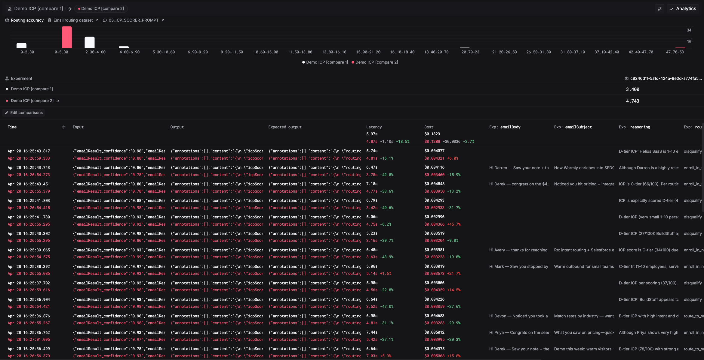 Instead of looking at results in isolation, run another version with a new prompt or a different model and compare them side by side. You can see exactly where it improved, where it regressed, and by how much.