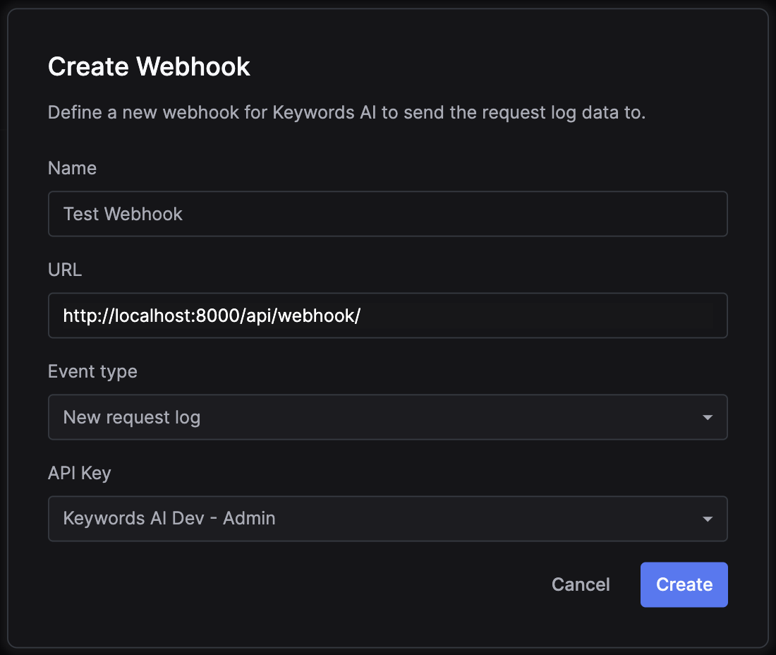 For example, when Respan logs a new request, your webhook and point can receive this notification as an API call from Respan.