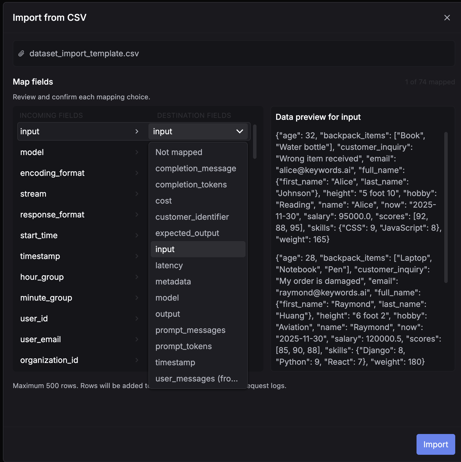 Create a CSV file with columns matching your prompt variables (without the {{}} syntax) and an optional ideal_output column. Go to Datasets, click Create dataset, and choose Insert from CSV. Map the CSV fields to dataset fields and import.